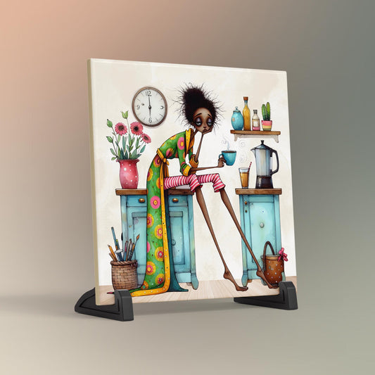 But First Coffee Black Woman Art Ceramic Tile, Trendy Wall Art Black Girl Art, Quirky African American Decor, Coffee Lovers Kitchen Decor