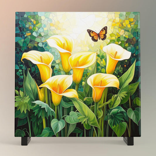 Cala Lillies and Butterflies Ceramic Tile, Custom Wall Art for Spring Summer Decor, Whimsical Floral Art, Ideal Gift for Nature Lovers