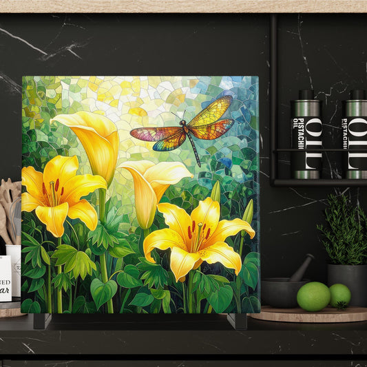 Cala Lillies and Dragonfly Ceramic Tile, Custom Wall Art for Spring Summer Decor, Whimsical Floral Art, Ideal Gift for Nature Lovers