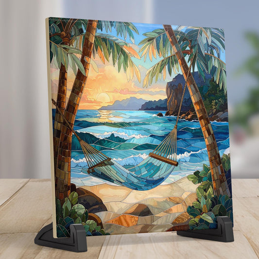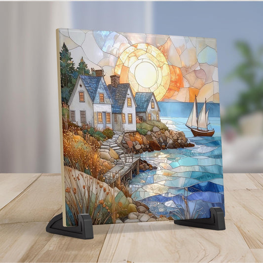 Coastal Living Ceramic Wall Art Tile, Stained Glass Look Art, Beautiful Ocean View Tile for Artful Display and Home Decor for Small Spaces
