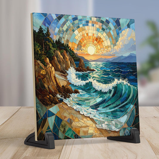 Coastal Waves Ceramic Wall Art Tile, Stained Glass Look Art, Beautiful Ocean View Tile for Artful Display and Home Decor for Small Spaces