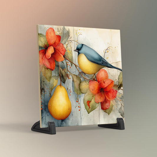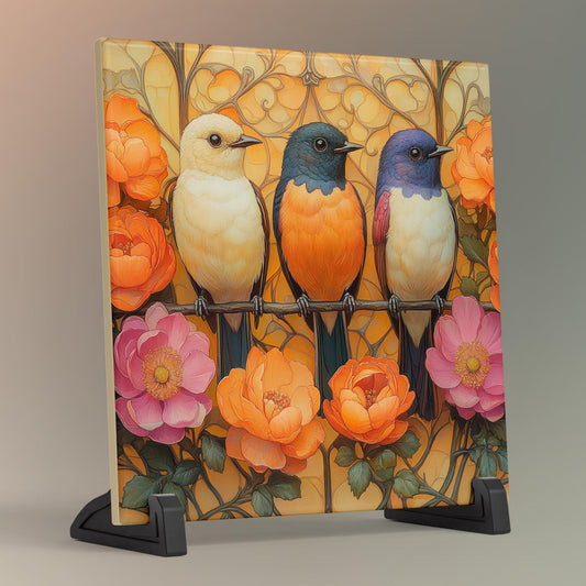 Colorful Birds and Flowers Tile Art, Whimsical Art Nouveau Decor for Bird Enthusiasts, Ideal Nature-Inspired Gift