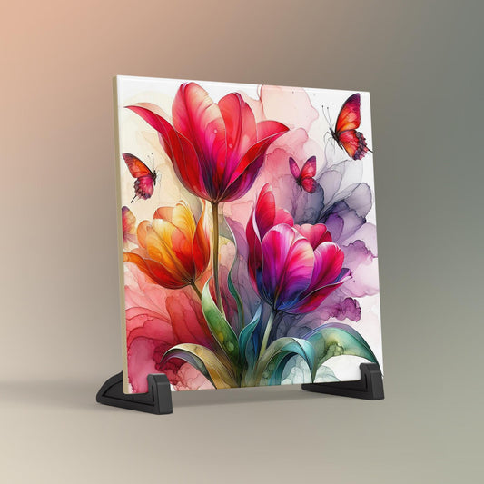 Colorful Tulips Ceramic Art Tile, Handcrafted Decorative Tile for Elegant Home Decor, Unique Gift for Art Lovers, Alcohol Ink Flowers