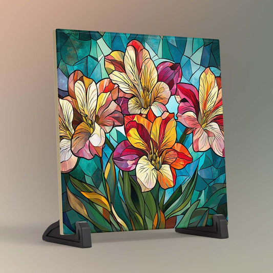 Colorful Flowers Ceramic Art Tile | Stained Glass-Inspired Wall Decor | Gallery Wall Art | Elegant Home Accent Gift for Mom