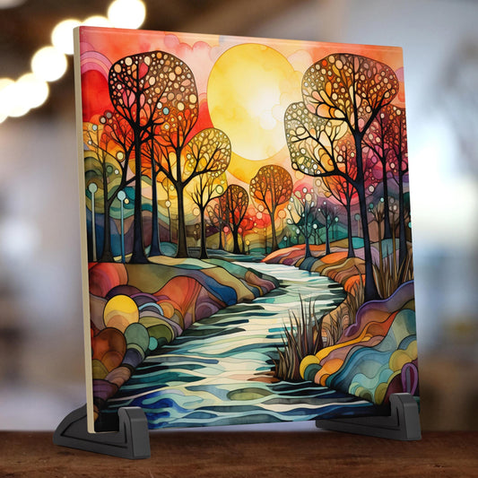 Abstract Countryside Ceramic Art Tile - Serene Watercolor Nature Art for Colorful Home Decor & Unique Gallery Wall Gift