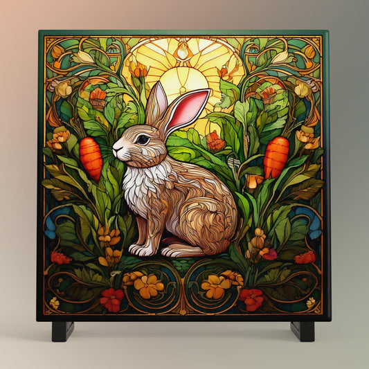Adorable Bunny with Carrot Ceramic Tile - Charming Stained Glass Effect Rabbit Decor - Farmhouse Style Gifts & Wall Art - Ready to Display
