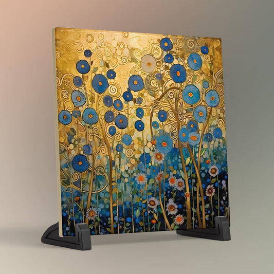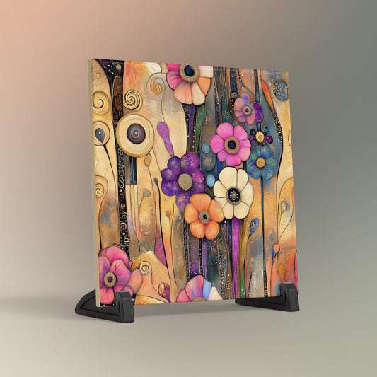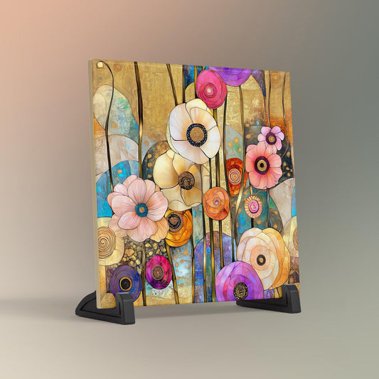 Abstract Flower Art Ceramic Tile, Klimt Inspired Flower Decor, Art Nouveau Wall Hanging - Art Print Ready to Display