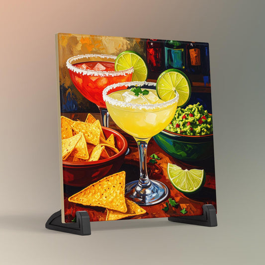 Margaritas with Guacamole and Chips Ceramic Art Tile | Watercolor Whimsical Quirky Art | Cocktail Art Bar Cart Decor | Trendy Kitchen Wall