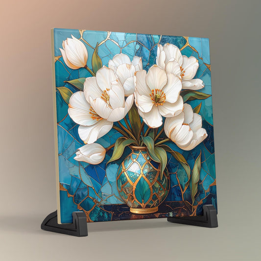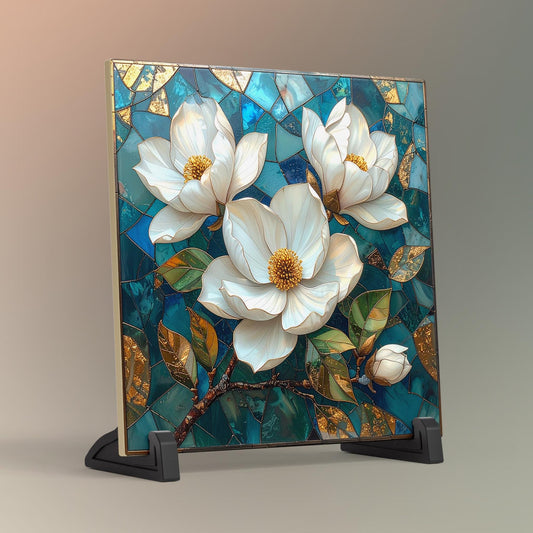 Magnolia Flowers Ceramic Tile Art - Art Deco Styled Stained Glass Look Elegant Flower Wall Decor - White Floral Home Decor