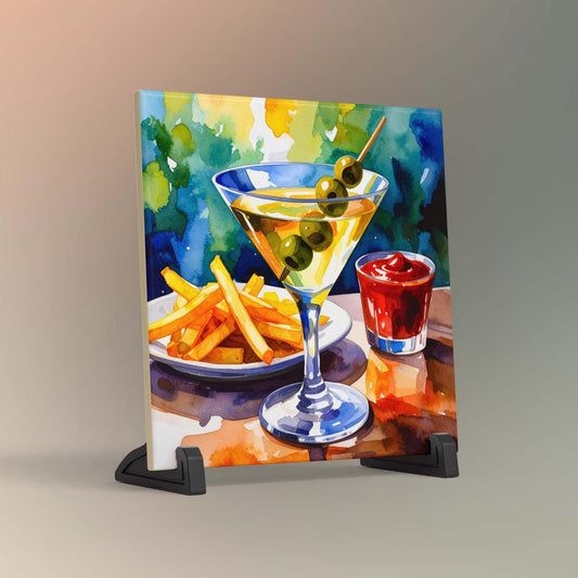 Martini and French Fries Ceramic Art Tile | Watercolor Art Print | Whimsical Quirky Art | Cocktail Art Bar Cart Decor | Trendy Kitchen Wall