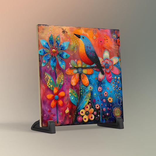 Quirky Birds Ceramic Tile Art, Whimsical Folk Art Decor for Bird Lovers, Perfect Nature-Inspired Gift and Home Accent