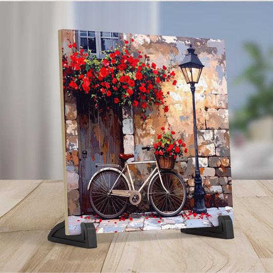 Rustic Bicycle Ceramic Art Tile - Charming Village Design with Bright Flowers - Unique Wall Decor - Great Gift for Cyclists
