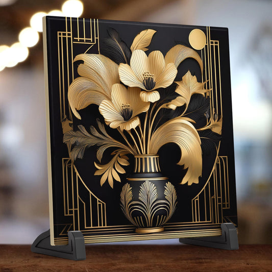 Art Deco Black and Gold Flowers in Vase Ceramic Tile Art - Stunning Art Nouveau Decorative Wall Hanging - Elegant Home Decor