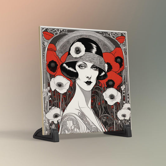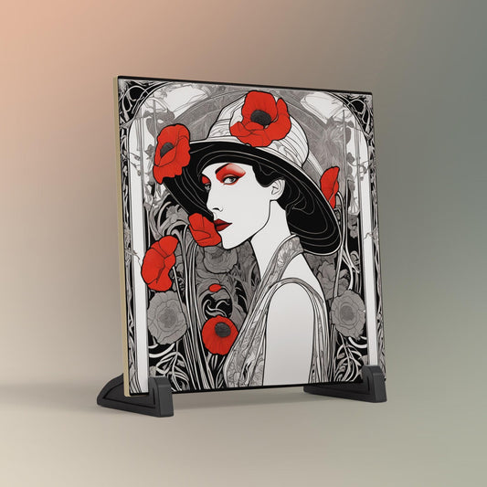 Art Deco Ceramic Tile Art - Red Poppies Woman Design - Elegant Wall Decor for Home - Unique Gift for Art Lovers - Black and White Art