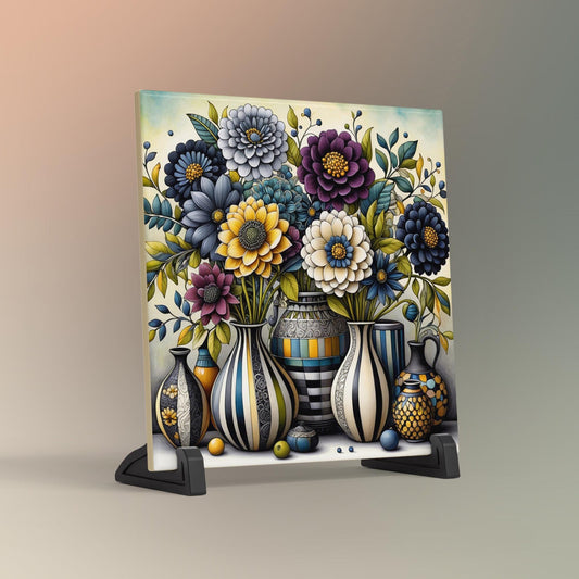 Art Deco Flower Ceramic Tile, Artistic Floral Vase Decor, Beautiful Home Accent, Botanical Art Print, Black and White Artwork