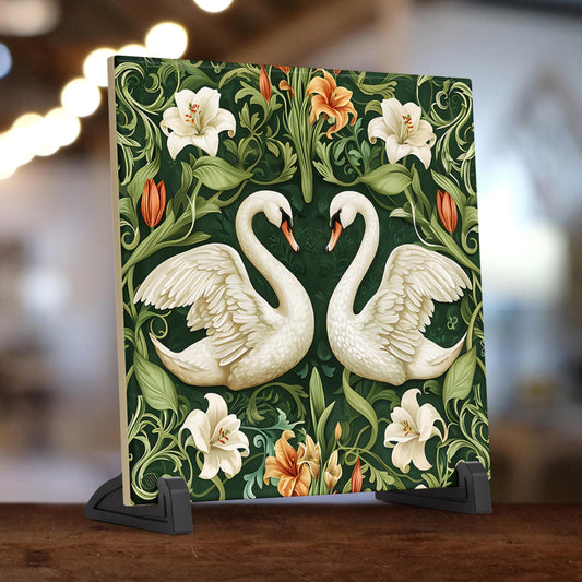 Art Nouveau White Swans Ceramic Tile, Decorative Art Tile, William Morris Inspired Art Deco Artwork, Unique Home Decor