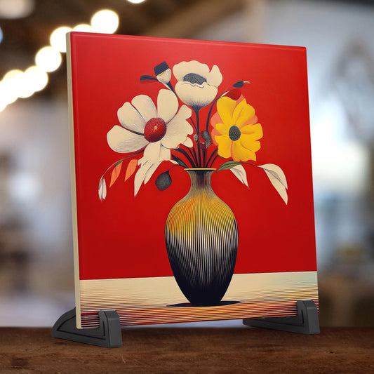 Floral Bouquet in Vase Ceramic Art Tile, Vibrant Abstract Flowers Wall Tile, Perfect Nature Inspired Gift, Contemporary Red Art