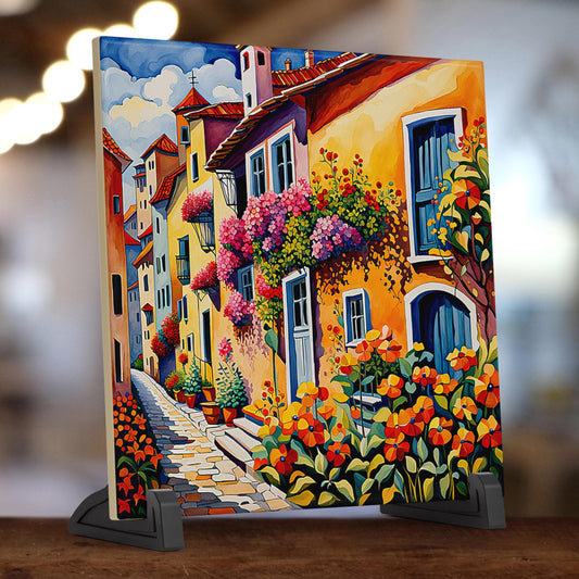 Village Streetscape with Flowers Tile, Handmade Ceramic Wall Decor for Unique Home Accent, Perfect Nature Inspired Gift - Style #2