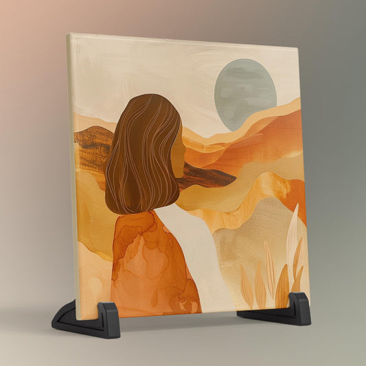 Boho Desert Art Ceramic Tile, Minimalist Mountain View Ceramic Wall Decor for Unique Home Accent, Boho Woman Art, Nature Inspired Gift