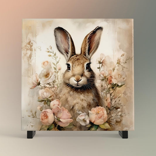 Boho Bunny Rabbit Art Tile - Shabby Chic Cottagecore Print - Beautiful Hare and Flower Art. - Perfect Nature Lover's Gift - Easter Artwork