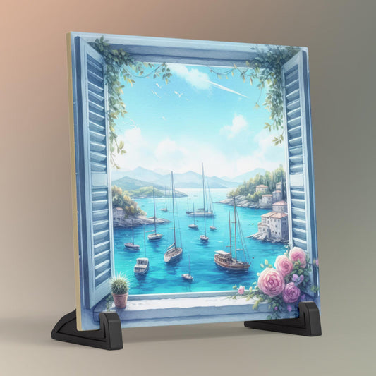 Beach View Window Ceramic Tile | Coastal Art with Sailboats | Nautical Decor | Ocean Art