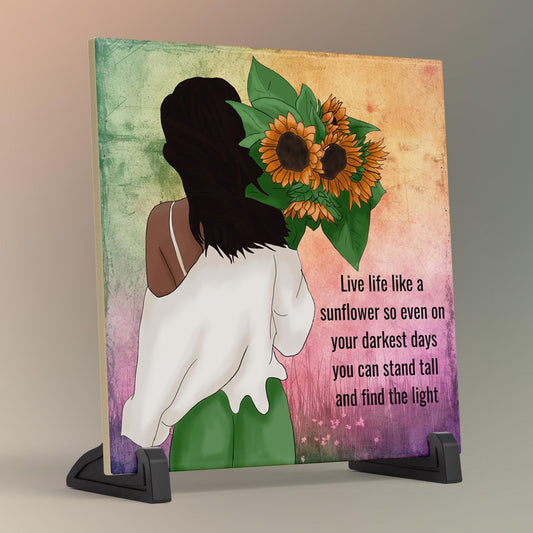 Black Woman Art Sunflower Ceramic Tile - Quote Art - Black Wall Art -Boho Floral Print - African American Woman - Live Like a Sunflower