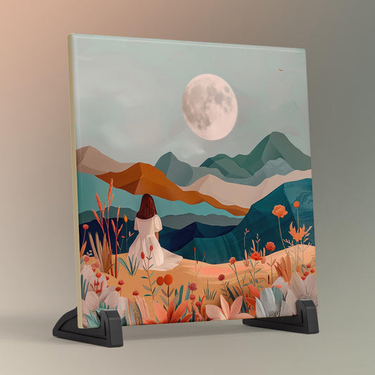 Desert Art Ceramic Tile, Boho Woman Art, Minimalist Mountain View Ceramic Wall Decor for Unique Home Accent, Nature Inspired Gift