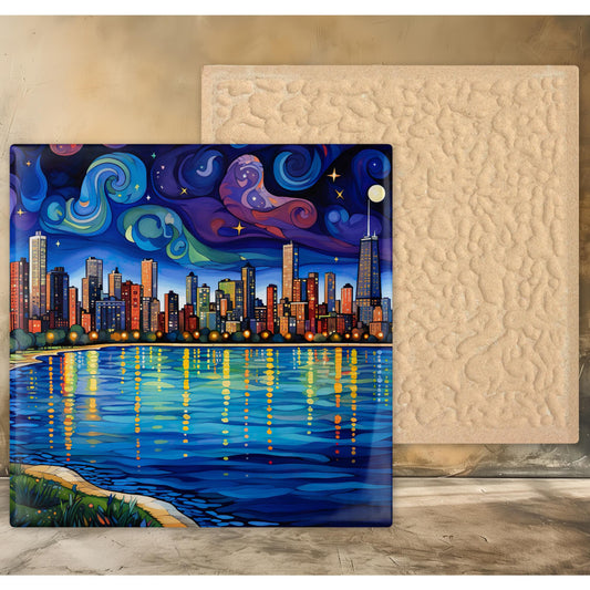 Chicago Starry Night Ceramic Art Tile, Iconic Chicago Lakefront Design, Whimsical City, Galley Wall Hanging, Chicago Art