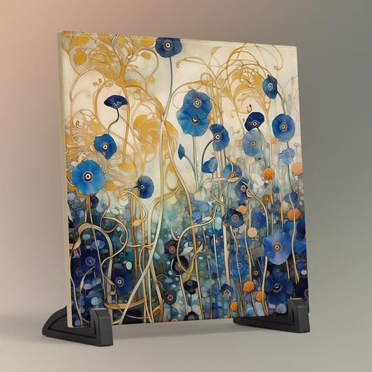 Klimt Inspired Ceramic Tile Wall Art, Abstract Floral Art Print, Art Nouveau Blue Poppies Wall Hanging - Art Print Ready to Display