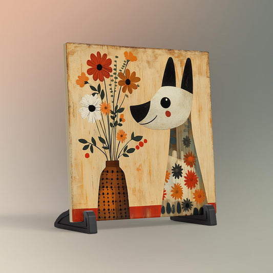 Quirky Dog Wall Art Ceramic Tile - Vintage Dog with Flowers in a Vase Art, Funky Dog Decor for Stylish Spaces, Art for Small Spaces