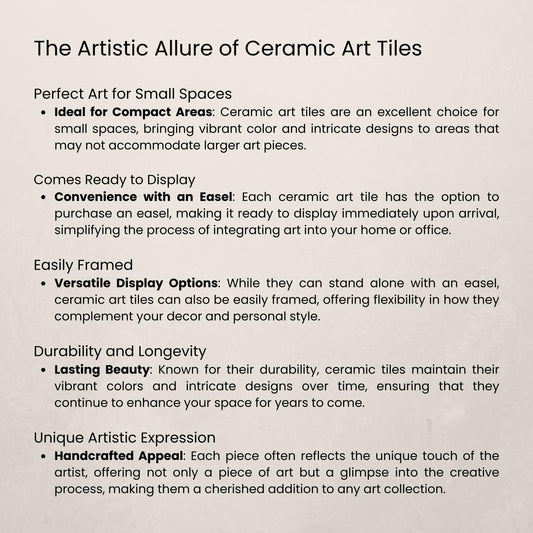 Transform your space with our exquisite ceramic art tiles, expertly crafted to blend functionality with artistic flair. Each tile features beautiful designs and vibrant colors, making it a perfect choice for home decor from the living room to the kitchen. These durable tiles are easy to clean and maintain, ensuring lasting beauty. Elevate your interior with our unique ceramic art tiles, adding a touch of elegance and creativity to any room. Perfect for art lovers and design enthusiasts.