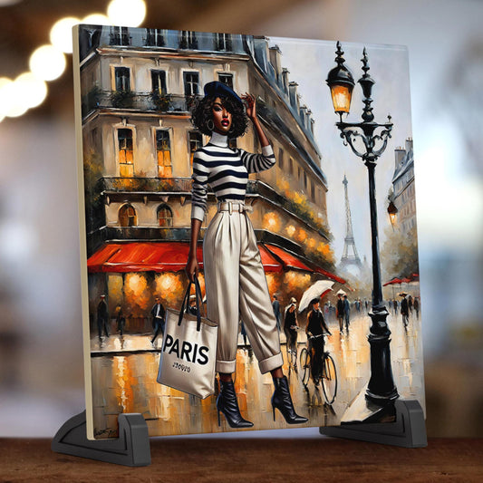 Black Woman in Paris Ceramic Tile - African American Wall Art - Paris Art Print - Eiffel Tower Streetscape - Unique Gift