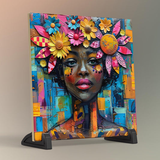 Boho Flowers Black Woman Art - Ceramic Art Tile - Black Wall Art - Abstract Floral Print - African American Woman - Unique Gift for Her
