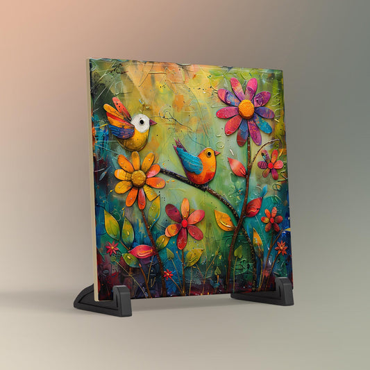 Quirky Birds Ceramic Tile Art, Whimsical Folk Art Decor for Bird Lovers, Perfect Nature-Inspired Gift and Home Accent