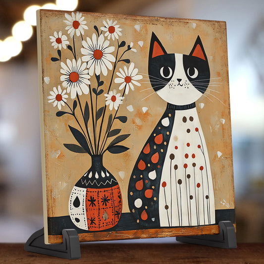 Vintage Cat Wall Art Ceramic Tile - Retro Cat with Flowers in a Vase Art, Funky Kitty Decor for Stylish Spaces, Art for Small Spaces