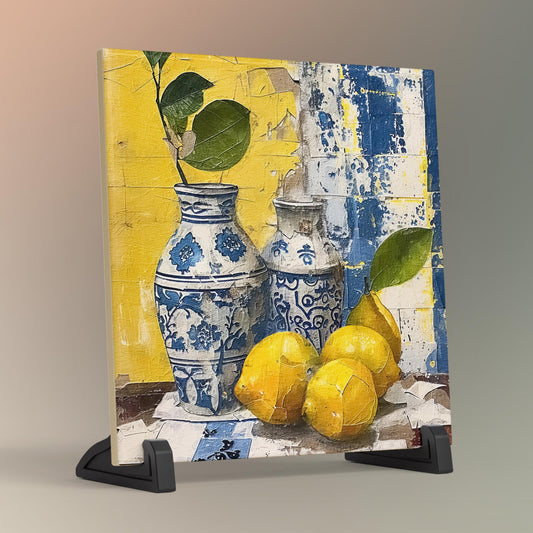 Luxurious Mediterranean Citrus and Blue Tile Art, Boho Kitchen Decor, Vintage Rustic Wall Art, Lisbon Inspired Coastal Artwork