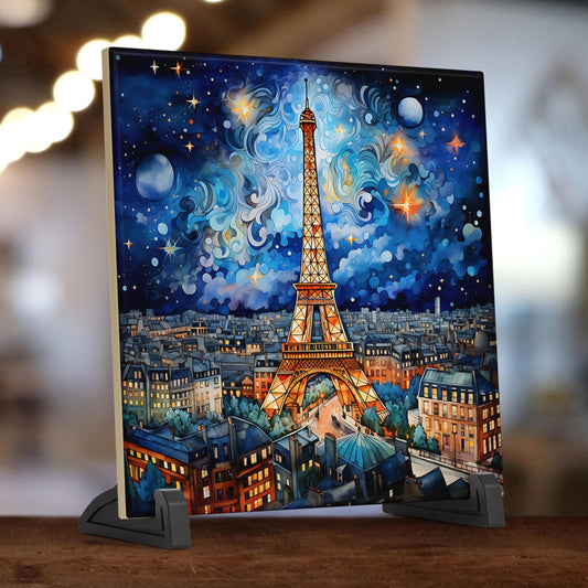 Starry Night in Paris Ceramic Art Tile - Whimsical Design, Vibrant Colors, Beautiful Tile Art for the Kitchen, Unique Art