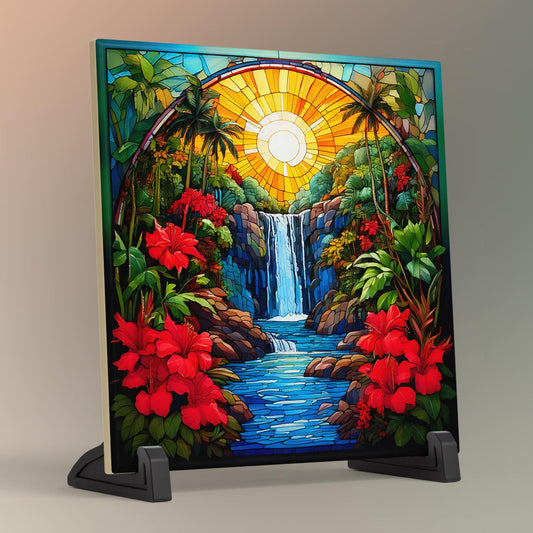 Coastal Art Ceramic Tile, Art Nouveau Tropical Waterfall Print with Colorful Red Flowers, Stained Glass Effect Nature Artwork