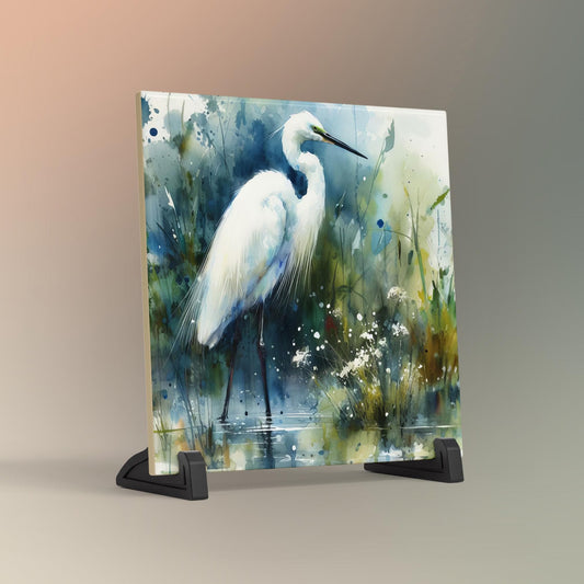 Watercolor Egret Art Tile, Marshland Landscape, Elegant Bird Wall Art, Minimalist Wildlife Painting