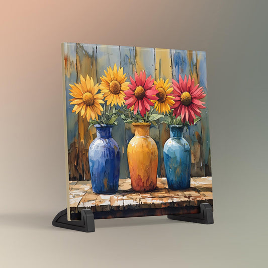 Rustic Floral Ceramic Art Tile, Colorful Flower Vase Decor, Farmhouse Accents for Spring and Summer