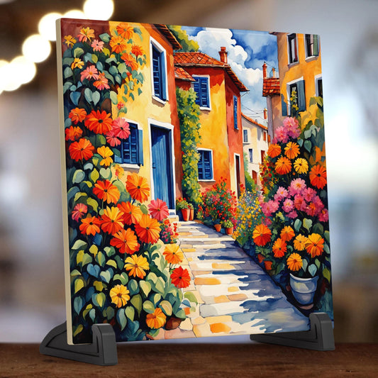 Village Street with Flowers Tile, Handmade Ceramic Wall Decor for Unique Home Accent, Perfect Nature Inspired Gift - Style #1