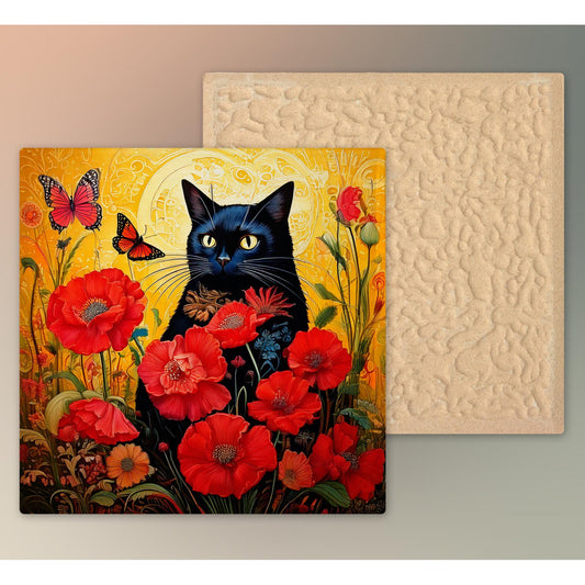 Black Cat Ceramic Art Tile | Art Nouveau Style | Beautiful Red Poppies | Floral Art | Ideal Gift for Cat Enthusiasts | Art Deco Home Decor
