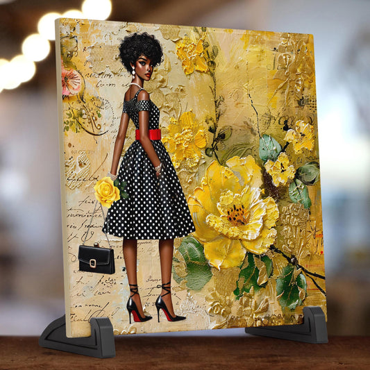Black Woman Art Ceramic Tile - African American Wall Art - Abstract Floral Print - Black Girl Art - Yellow Floral Decor - African Art