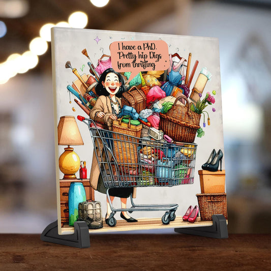 Quirky Woman Shopaholic Ceramic Tile, Funny Art for Thrifters, Quirky Decor, Hilarious Gift for Your Bestie