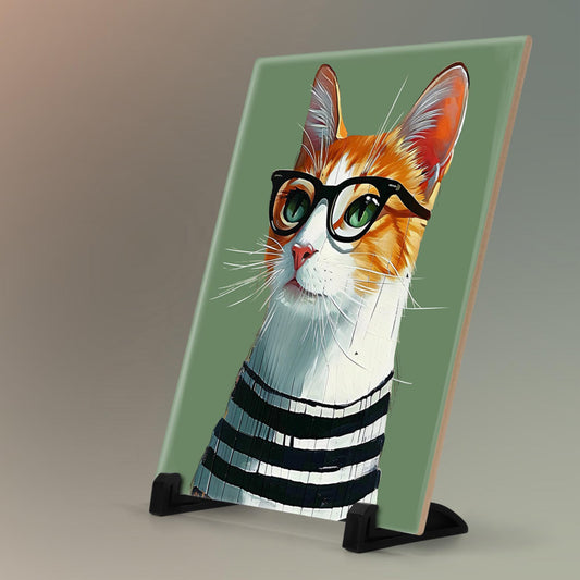 Smarty Cat Ceramic Wall Tile | Adorable Cat with Glasses Decor | 8x10" |Perfect Minimalist Home Accent | Gift for Cat Enthusiasts