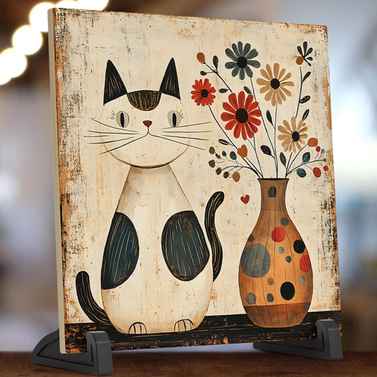 Vintage Cat with Flowers Ceramic Tile Art - Retro Wall Art - Unique Funky Decor for Cat Enthusiasts - Minimalist Home Accessories