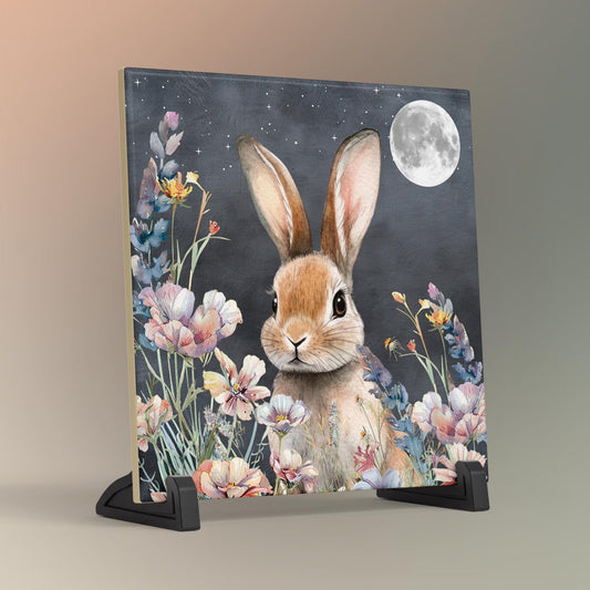 Midnight Easter Bunny Ceramic Art Tile, Whimsical Spring Wall Decor, Perfect for Farmhouse Aesthetics, Rabbit Art