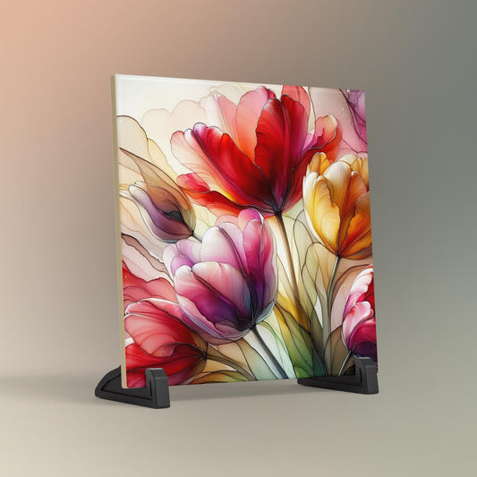 Colorful Tulips Ceramic Art Tile, Handcrafted Decorative Tile for Elegant Home Decor, Unique Gift for Art Lovers, Alcohol Ink Flowers