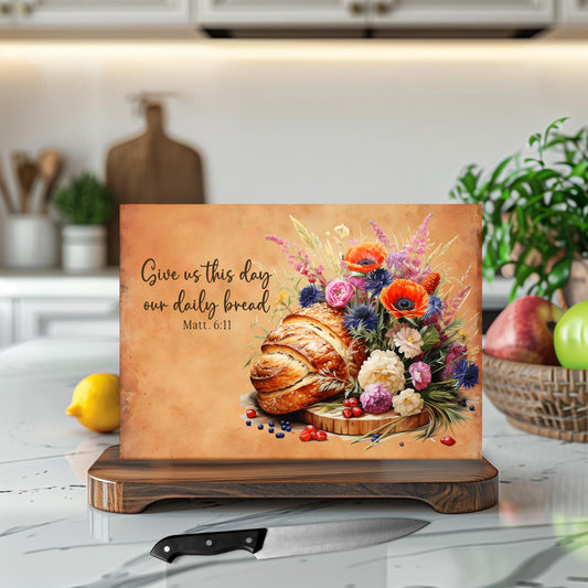 Inspirational Glass Cutting Board - "Give Us This Day Our Daily Bread" Tempered Chopping Board for Cheese & Charcuterie Gift