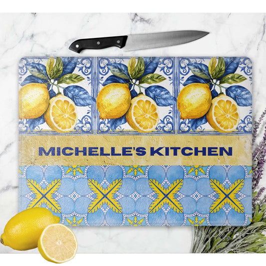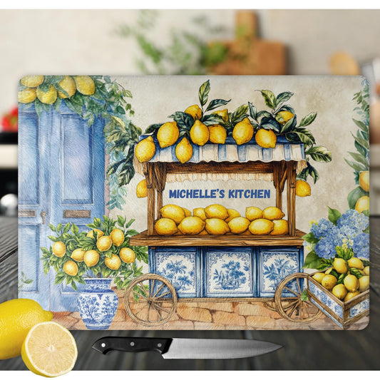 Whimsical Lemon Personalized Cutting Board - Mediterranean Tempered Glass Chopping Board for Cheese & Charcuterie, Functional Kitchen Art
